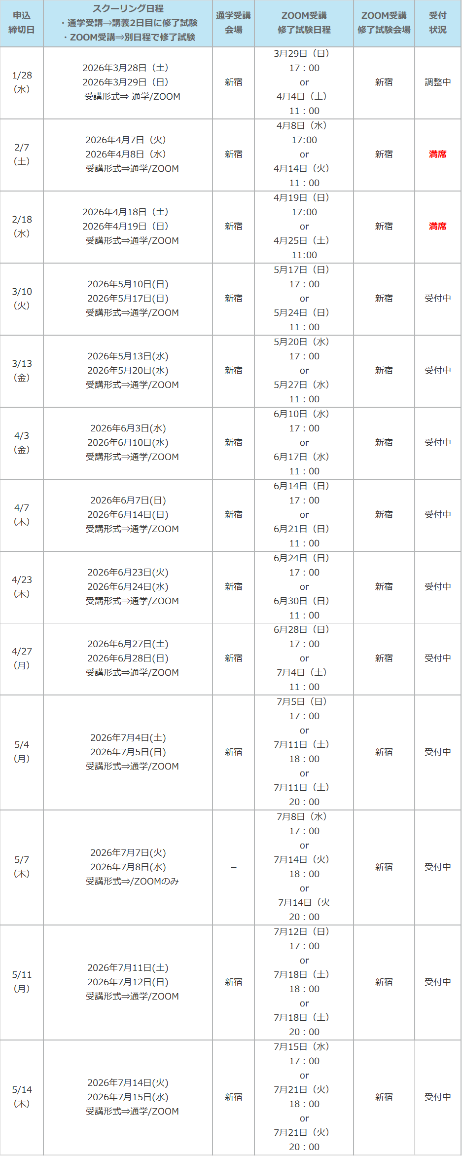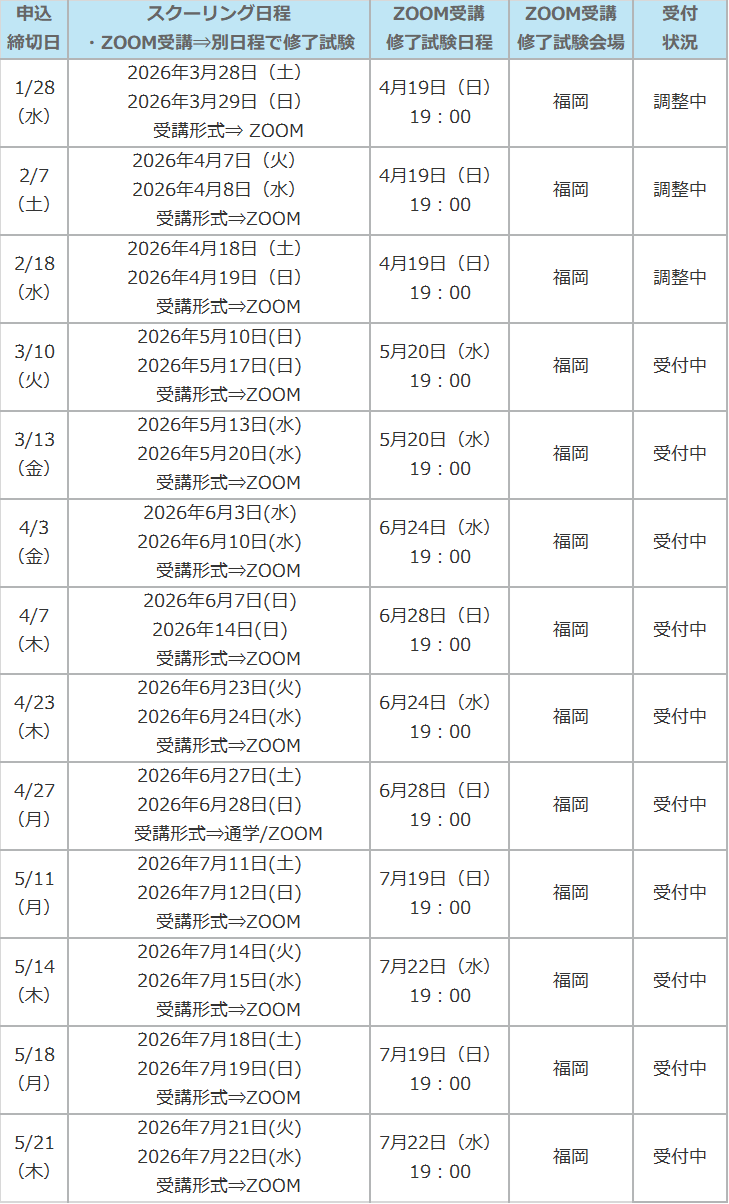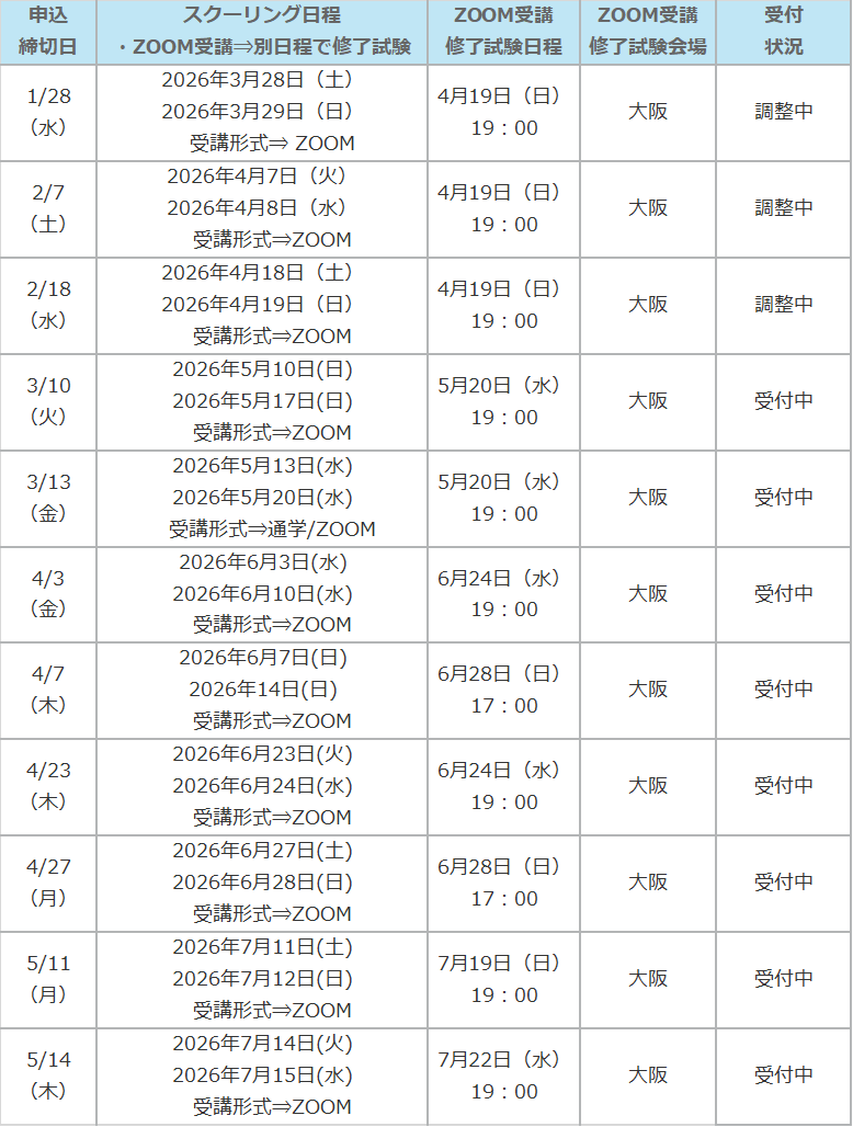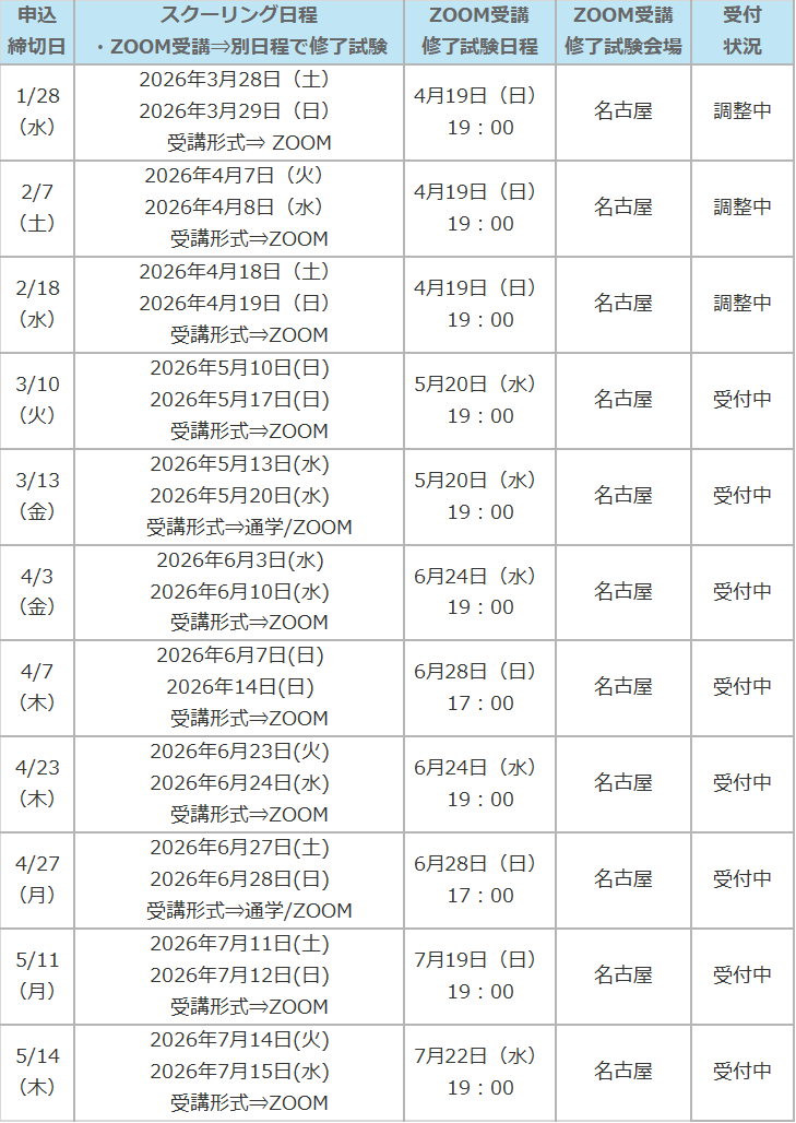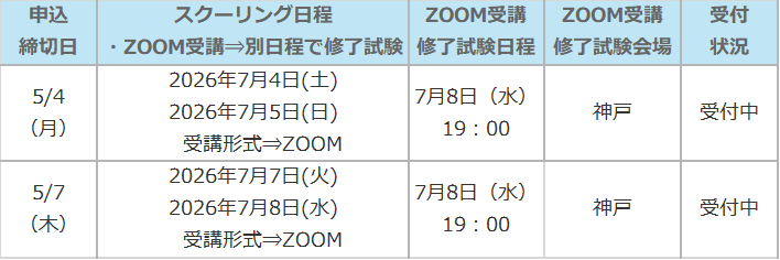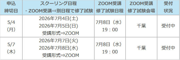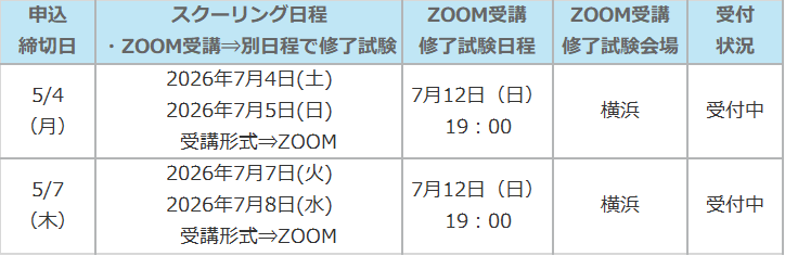 ※ ZOOM受講をご選択の場合は、修了試験を「ZOOM受講修了試験日程」の日時にて試験会場で受験していただきます。スクーリング日程によって「修了試験日程」が設定されておりますので、全日程について受講可能な日程をご選択ください。申込みフォームお申込の際に日程のご選択をお願い致します。