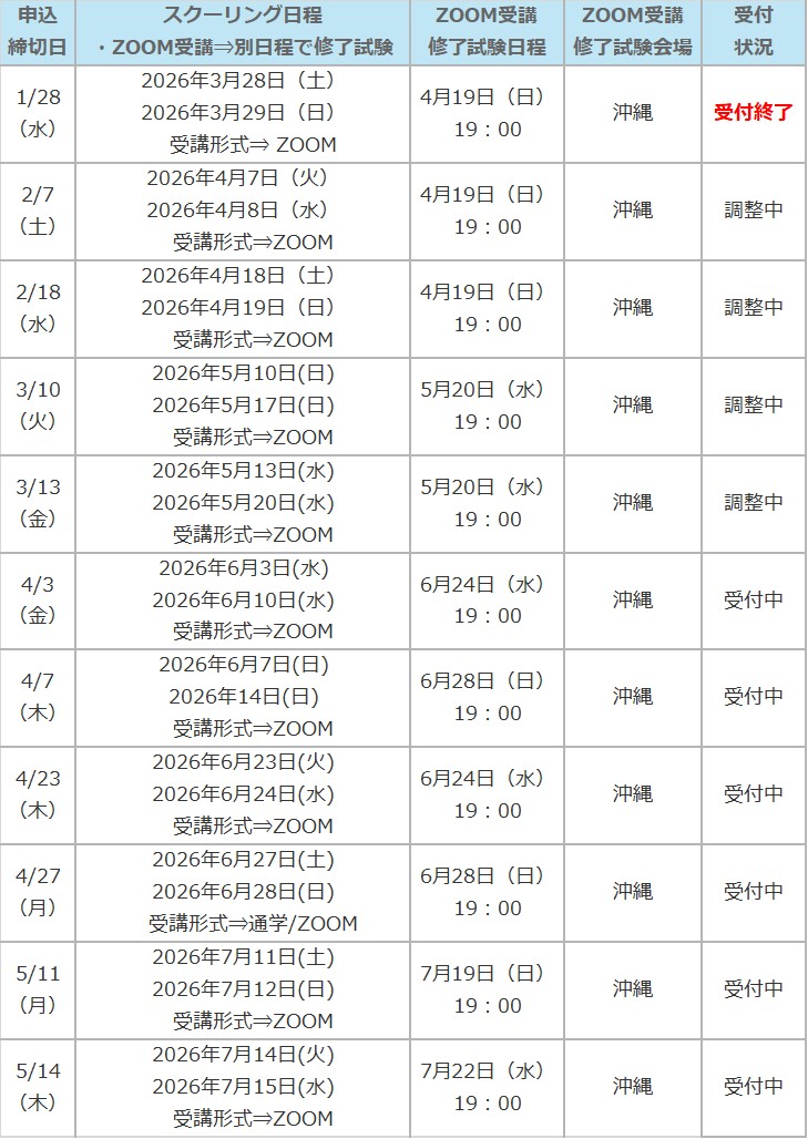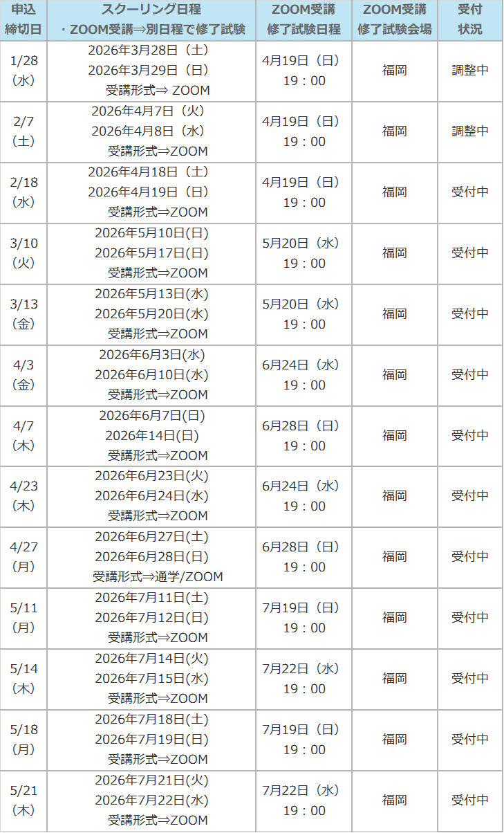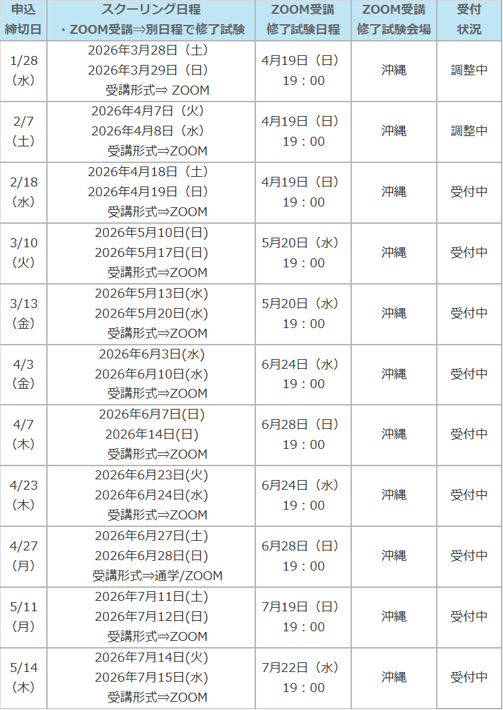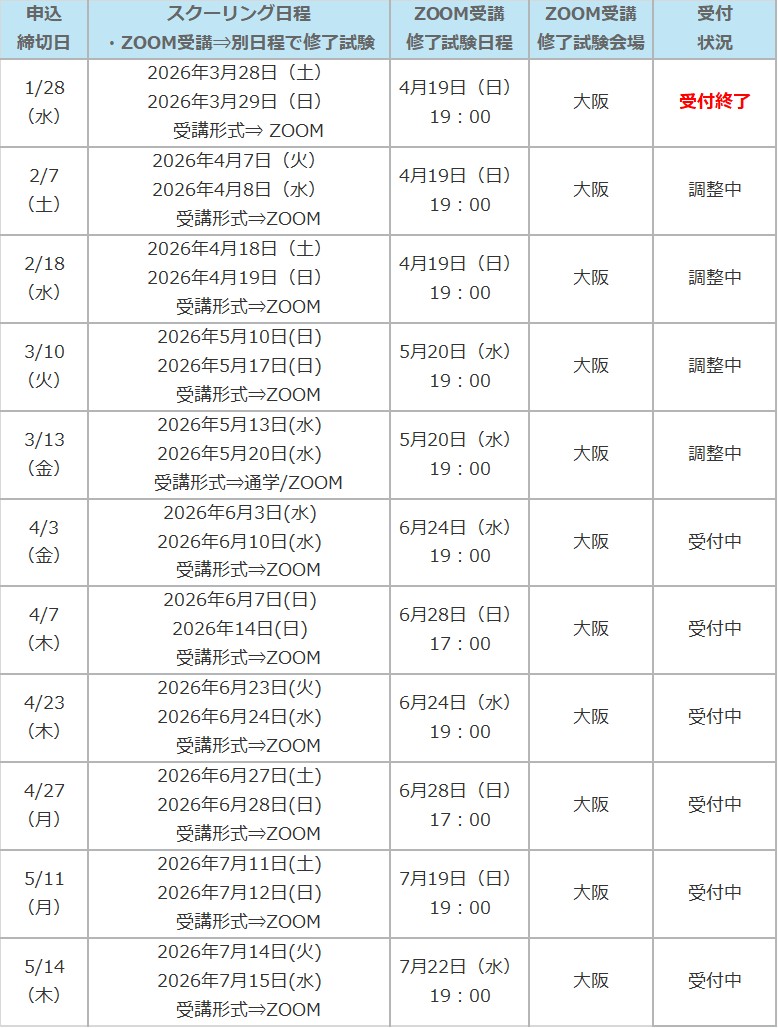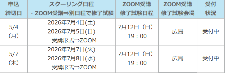 ※ ZOOM受講をご選択の場合は、修了試験を「ZOOM受講修了試験日程」の日時にて試験会場で受験していただきます。スクーリング日程によって「修了試験日程」が設定されておりますので、全日程について受講可能な日程をご選択ください。申込みフォームお申込の際に日程のご選択をお願い致します。