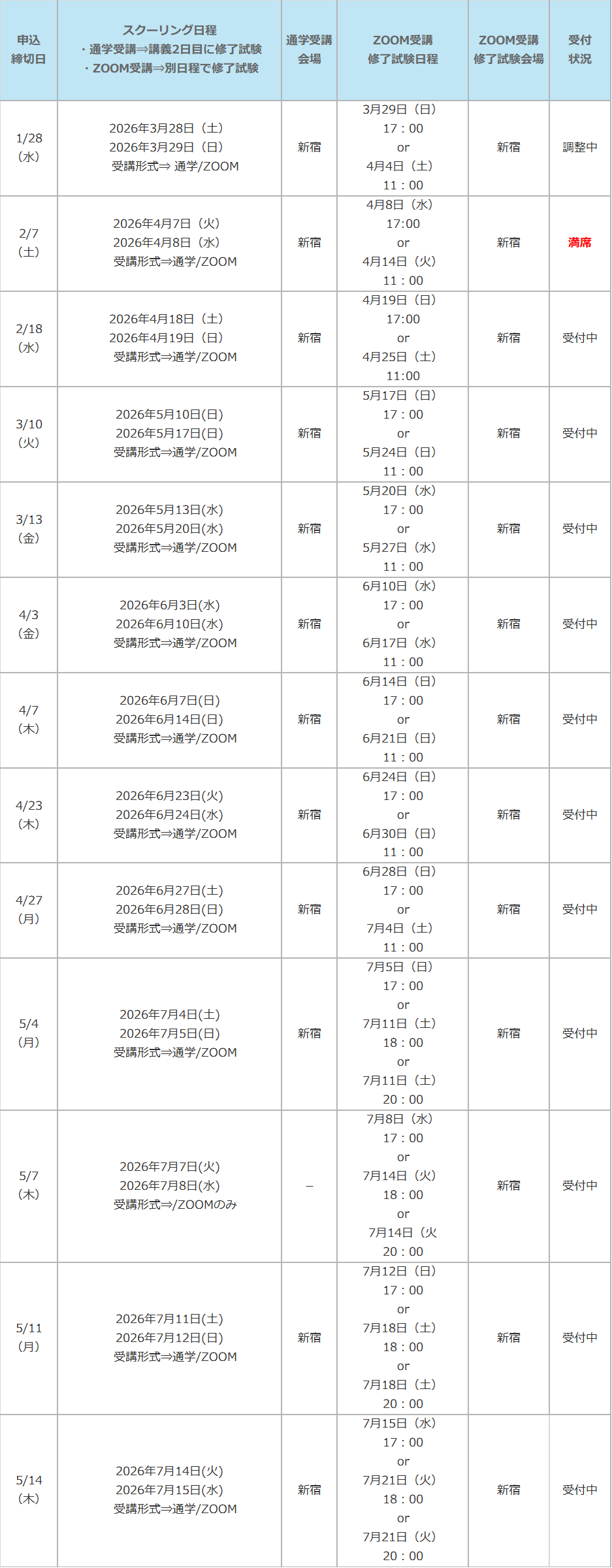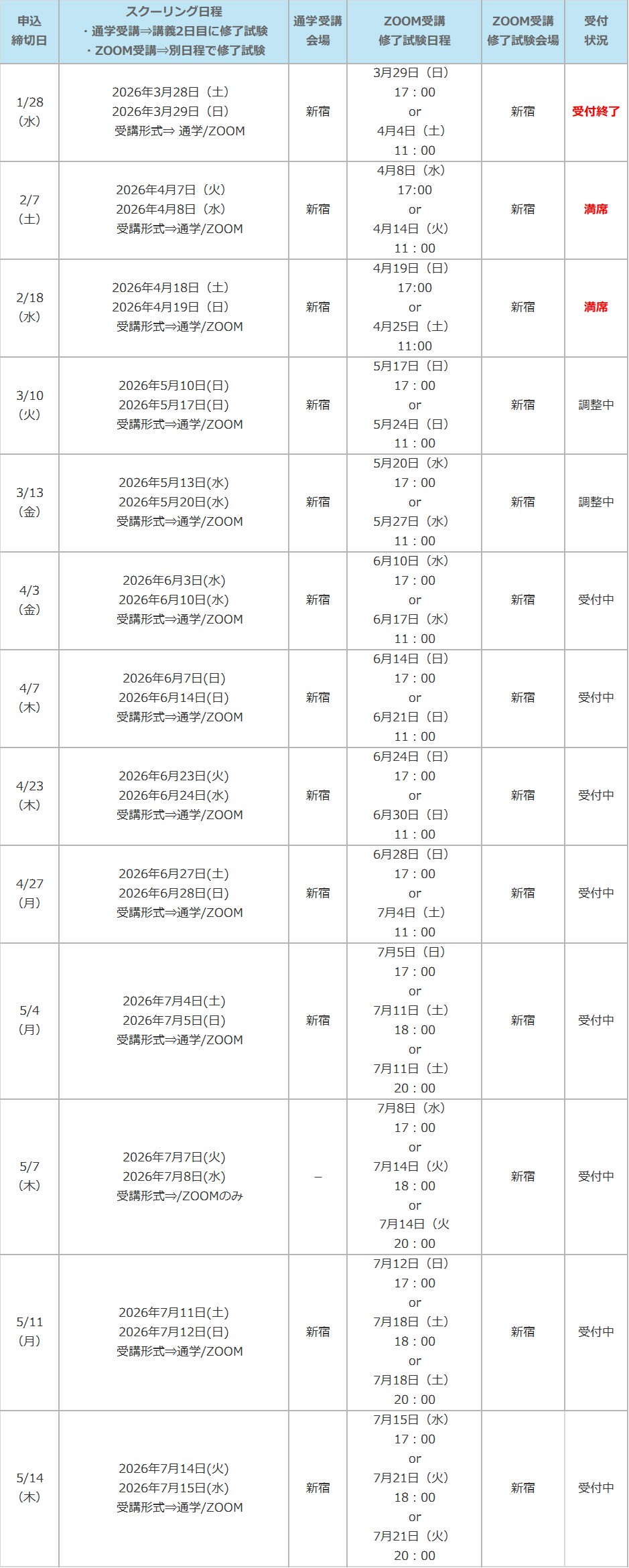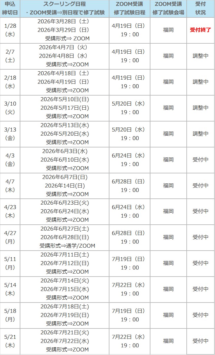 ※ ZOOM受講をご選択の場合は、修了試験を「ZOOM受講修了試験日程」の日時にて試験会場で受験していただきます。スクーリング日程によって「修了試験日程」が設定されておりますので、全日程について受講可能な日程をご選択ください。申込みフォームお申込の際に日程のご選択をお願い致します。