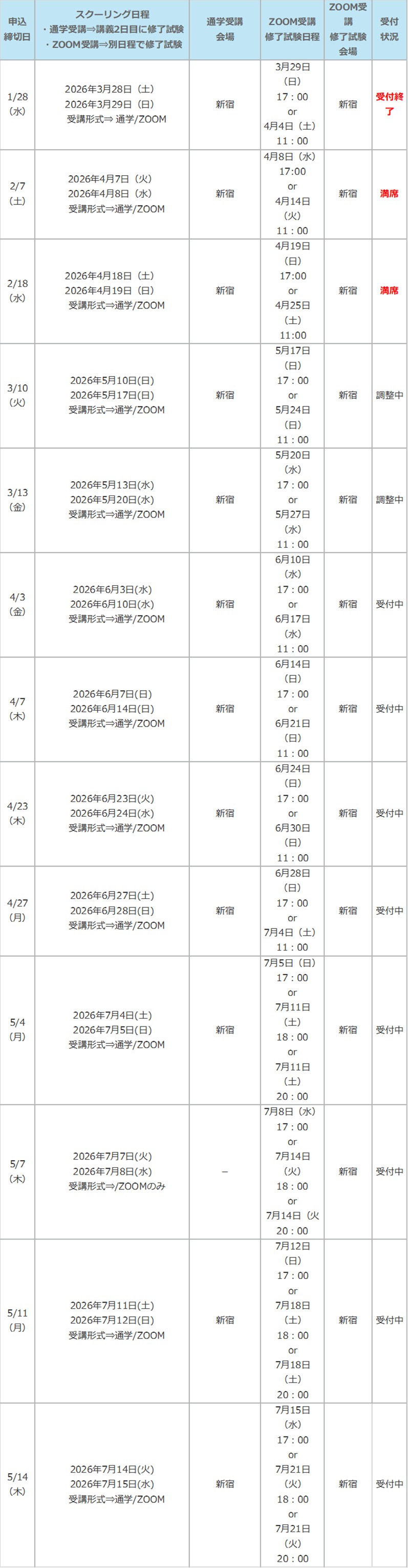 ・2026年度登録講習日程については下記の表をご覧ください。